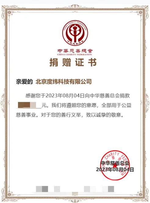 近日,隨著臺(tái)風(fēng)“杜蘇芮”北上,河北涿州受到暴雨肆虐以及多河道泄洪影響,發(fā)生嚴(yán)重洪澇災(zāi)害,轄區(qū)內(nèi)多個(gè)地市汛情告急,個(gè)別區(qū)域道路大量積水,交通不暢。為緩解災(zāi)區(qū)生活物資緊缺問(wèn)題,全面履行企業(yè)抗災(zāi)責(zé)任,度緯科技特向中華慈善總會(huì)捐款以援助河北涿州抗洪救災(zāi)以及災(zāi)后重建工作。