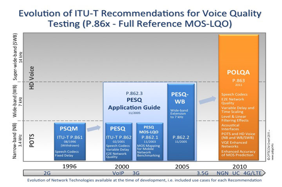 2010年6月,因移動網(wǎng)絡(luò)VoLTE、VoNR、互聯(lián)網(wǎng)通話軟件SKYPE(現(xiàn)為MS Teams)等新傳輸技術(shù)及高階的編碼方式的快速發(fā)展及應(yīng)用,語音質(zhì)量評估方法的要求不斷提高,ITU推出了ITU-T P.863,采納了OPTICOM、SwissQual和TNO的聯(lián)合解決方案POLQA為新一代的語音質(zhì)量評估算法。POLQA算法支持可變的輸入信號電平范圍、更寬的信號帶寬(從窄帶到超寬帶)及最新的語音編碼技術(shù)(Skype、EVS等),對3G、4G/LTE和VoIP網(wǎng)絡(luò)評估具有更高的準(zhǔn)確度,并擴(kuò)展了對提供高清語音服務(wù)的網(wǎng)絡(luò)的支持。POLQA算法的評分范圍是1-5分,5分為最高分。現(xiàn)在的線上會議,通話等一般采用的都是POLQA算法。