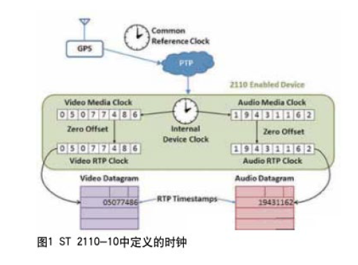 ST 2110-10最重要的方面可能與時鐘和定時相關(guān)。與SDI和MPEG傳輸流不同,2110系統(tǒng)中每種媒體以獨立的IP數(shù)據(jù)包流傳輸,這導致要求一種一旦信號通過一個網(wǎng)絡(luò)后根據(jù)信號恰當?shù)臅r序關(guān)系重新調(diào)整它們的機制。圖1顯示若干此規(guī)范中定義的不同的時鐘;每個時鐘起特定的作用: