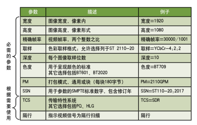 以不到一千字定義圖像ST 2110-20文件其余大部分專用于定義被傳輸?shù)囊曨l信號之準(zhǔn)確格式。RFC4566中規(guī)定的會話描述協(xié)議為此信息提供一個機器可讀的布局。