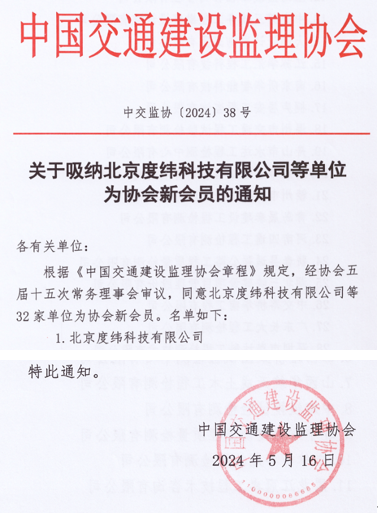 5月16日,根據(jù)《中國交通建設(shè)監(jiān)理協(xié)會章程》規(guī)定,經(jīng)協(xié)會五屆十五次常務(wù)理事會審議,北京度緯科技有限公司正式成為中國交通建設(shè)監(jiān)理協(xié)會的一員。此次加入不僅標(biāo)志著度緯科技在交通建設(shè)領(lǐng)域的專業(yè)能力和服務(wù)水平得到了行業(yè)的高度認(rèn)可,也為其未來的發(fā)展提供了更廣闊的平臺和更多的機(jī)遇。