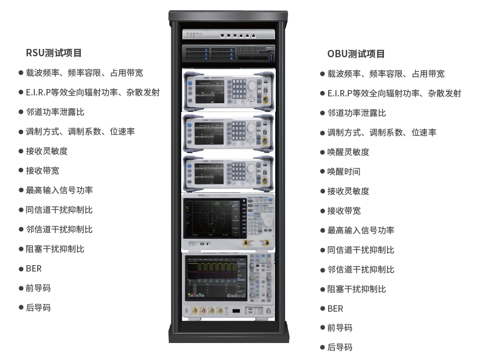 測(cè)試分為RSU測(cè)試和OBU測(cè)試,兩者又分為信號(hào)發(fā)生測(cè)試和信號(hào)接收測(cè)試,通過(guò)配合使用測(cè)試系統(tǒng)中的測(cè)試設(shè)備可進(jìn)行諸多指標(biāo)的測(cè)試,RSU和OBU的信號(hào)發(fā)生測(cè)試項(xiàng)目一樣,OBU的信號(hào)接收測(cè)試項(xiàng)目比RSU多出喚醒靈敏度和喚醒時(shí)間兩項(xiàng),具體測(cè)試指標(biāo)如下。