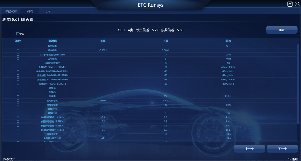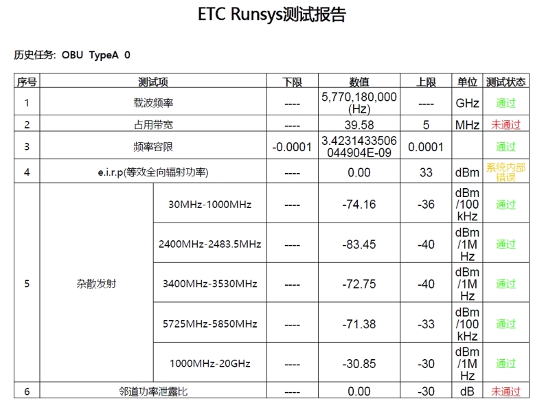 系統(tǒng)中的核心設(shè)備均可通過(guò)ETC Runsys軟件遠(yuǎn)程實(shí)現(xiàn)自動(dòng)化控制?;谲浖?shí)現(xiàn)了被測(cè)物測(cè)試流程及數(shù)據(jù)分析結(jié)果可視化,便于查看測(cè)試結(jié)果;系統(tǒng)測(cè)試框架清晰流程合理,簡(jiǎn)化了測(cè)試流程中的邏輯判斷。系統(tǒng)支持依據(jù)國(guó)家標(biāo)準(zhǔn)GB/T 20851.5-2019對(duì)RSU與OBU進(jìn)行高效測(cè)試。