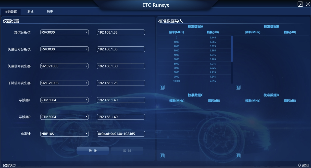 參數(shù)設(shè)置功能中可以配置不同的測(cè)試設(shè)備以及設(shè)備所對(duì)應(yīng)的型號(hào),配置完成后輸入對(duì)應(yīng)設(shè)備的IP即可與設(shè)備相連接并控制。連接測(cè)試設(shè)備后可以根據(jù)需要導(dǎo)入測(cè)試儀器的校準(zhǔn)數(shù)據(jù),確保后續(xù)測(cè)試結(jié)果的準(zhǔn)確性。