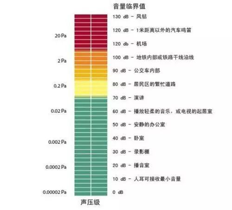 另外,當(dāng)聲壓達(dá)到20Pa,即聲壓級(jí)為120dBSPL時(shí),人耳會(huì)感覺到疼痛,因此,在聲學(xué)或醫(yī)學(xué)上把20Pa=120dBSPL定義為痛閾,長(zhǎng)時(shí)間在此環(huán)境下工作,會(huì)對(duì)聽覺系統(tǒng)造成傷害。