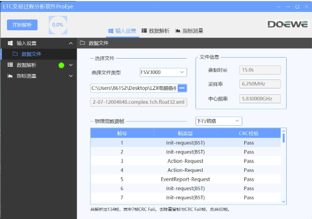 ProEye軟件能夠?qū)︿浿葡聛淼纳漕l文件進(jìn)行解析,支持解析射頻層指標(biāo)、應(yīng)用層及設(shè)備應(yīng)用層的關(guān)鍵交互語句和數(shù)據(jù)特征。以下展示的是軟件的實(shí)際測(cè)試界面。