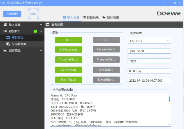 ETC系統(tǒng)通信流程的具體過程是:當(dāng)裝載有OBU單元的車輛經(jīng)過ETC門架時(shí),OBU與RSU之間能夠快速的進(jìn)行一些信號(hào)交互,系統(tǒng)在接收到來自OBU的信號(hào)后能夠準(zhǔn)確的讀取到車輛信息并在確認(rèn)無誤后完成計(jì)費(fèi),使車輛能夠順利通過。本文介紹一種由北京度緯科技有限公司提供的測(cè)試軟件ProEye,此款軟件能夠輔助用戶進(jìn)行ETC通信流程的分析,進(jìn)而提高測(cè)試效率。