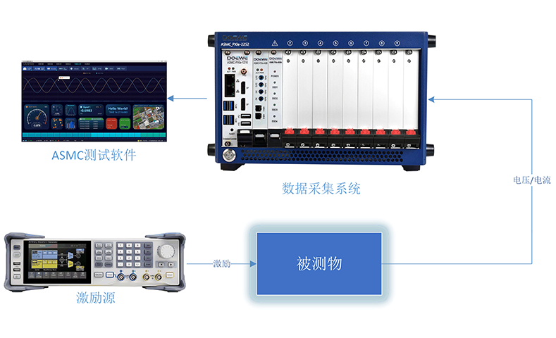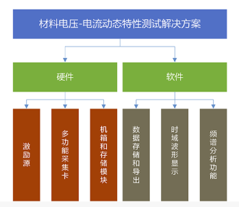 本方案旨在為材料提供電壓-電流動態(tài)特性測試解決方案。通過激勵源對材料施加特定波形的電壓或電流激勵,使用數(shù)據(jù)采集系統(tǒng)采集經(jīng)過材料后的電壓、電流等信號變化,以此分析材料的動態(tài)特性。通過對電壓和電流信號的精準采集,可以實時監(jiān)測材料在不同電氣條件下的反應,幫助用戶深入了解材料在實際工作狀態(tài)下的性能表現(xiàn)。這一過程對于評估材料的導電性、熱穩(wěn)定性和抗壓能力等特性至關重要,為材料的優(yōu)化與設計提供科學數(shù)據(jù)支持。測試系統(tǒng)整體結(jié)構圖如下: