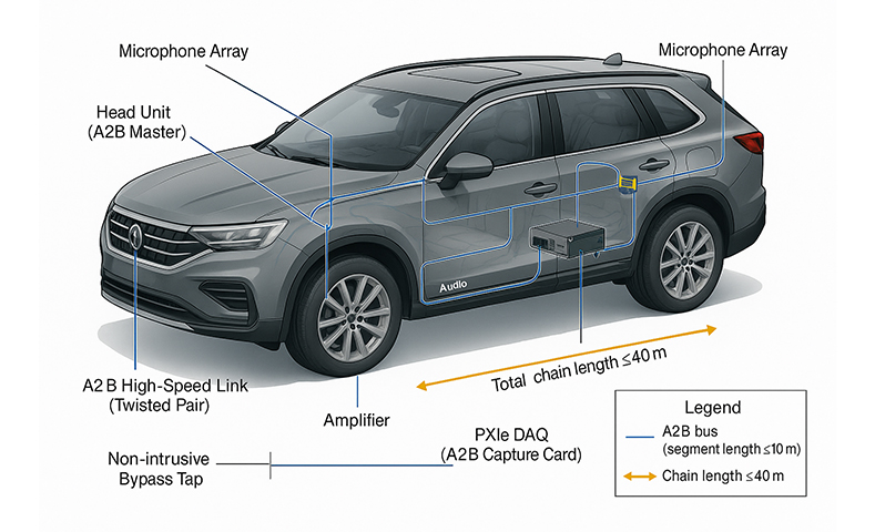 隨著座艙語(yǔ)音交互、主動(dòng)降噪(ANC)與分區(qū)音響的應(yīng)用深化,A2B(Automotive Audio Bus)在整車中承擔(dān)了更多時(shí)序敏感、通道眾多的音頻傳輸任務(wù)。A2B以單對(duì)非屏蔽雙絞線實(shí)現(xiàn)音頻與控制的同步傳輸,具備約50 Mbps的帶寬與確定性、微秒級(jí)的逐跳時(shí)延,且各節(jié)點(diǎn)時(shí)鐘保持相位對(duì)齊,這使其非常適合多麥陣與分區(qū)播放等場(chǎng)景,但也對(duì)鏈路穩(wěn)定性和時(shí)序一致性提出更嚴(yán)苛要求。真實(shí)車輛中,電源波動(dòng)、EMC耦合與線束布局可能引發(fā)幀錯(cuò)誤、鏈路重建或抖動(dòng)累積,單靠靜態(tài)臺(tái)架往往難以捕獲并復(fù)現(xiàn)。為此,我們基于模塊化數(shù)據(jù)采集平臺(tái),提供專注于A2B鏈路的無(wú)損接入、長(zhǎng)時(shí)記錄與在線監(jiān)聽方案,通過協(xié)議事件與音頻載荷的同步采集,建立“發(fā)現(xiàn)—定位—復(fù)核—優(yōu)化”的閉環(huán)。