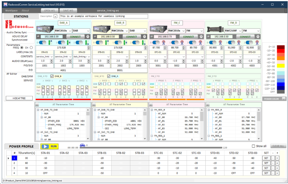 在數(shù)字廣播當(dāng)中,業(yè)務(wù)伴隨是通過(guò)DAB、DRM與FM三種調(diào)制方式之間的替換頻率(Alternate Frequency)以及業(yè)務(wù)鏈接(Service Linking)來(lái)實(shí)現(xiàn)的。本文中將使用Redwood Comm的廣播信號(hào)發(fā)生器RWC2010C、應(yīng)急廣播測(cè)試儀RWC2100F以及核心功能軟件《Service Linking test tool》提供一種測(cè)試解決方案。