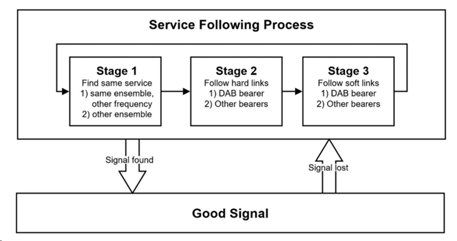 階段一:嘗試在當(dāng)前區(qū)域的其他總成信號(hào)中查找擁有相同SId的DAB業(yè)務(wù)。需識(shí)別所有擁有與當(dāng)前節(jié)目“完全相同”業(yè)務(wù)信息的DAB總成信號(hào)。接收機(jī)也將只返回?cái)y帶與用戶(hù)選擇的業(yè)務(wù)相同的業(yè)務(wù)(即相同的ECC與SId)的總成信號(hào)。這個(gè)階段中應(yīng)優(yōu)先傳輸與用戶(hù)原本選擇的業(yè)務(wù)含有相同業(yè)務(wù)的那個(gè)頻率的總成信號(hào)。