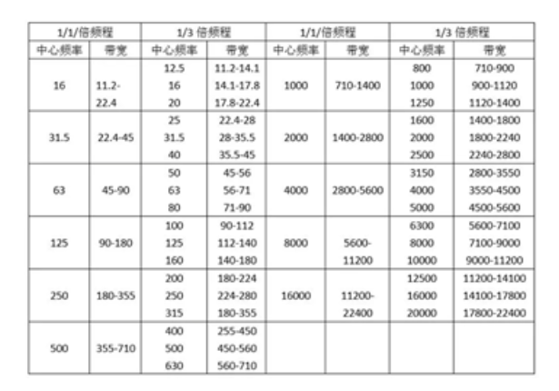 參考圖5倍頻程表格,判斷其屬于哪個帶寬內(nèi),以此作為依據(jù)計算一個倍頻程帶寬內(nèi)的信號的平均功率,以圖3圖4為例,1.5kHz屬于1400Hz-2800Hz范圍內(nèi),因此我們計算1400Hz-2800Hz頻率范圍內(nèi)的信號的平均聲壓級為P0。