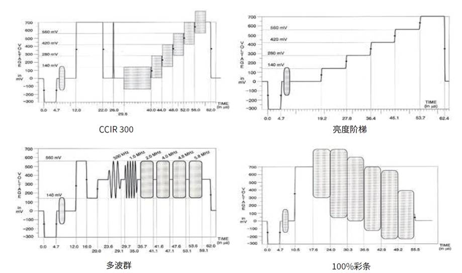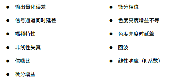 復合視頻測試支持:視頻輸出幅度,亮度波形失真,亮色時延差,DG/DP,亮度非線性失真,視頻頻響和同步特性指標;