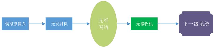 為了維持較好的傳輸質(zhì)量,傳統(tǒng)模擬視頻傳輸系統(tǒng)往往會采取光發(fā)光收的方式,將模擬信號(甚至是數(shù)字化后的HDMI信號)通過光發(fā)射機進行光調(diào)制傳輸,然后再利用光接收機進行光解調(diào)后輸入下一級系統(tǒng)。如圖1所示: