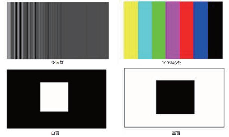 HD提供綜合測試圖、 多波群、100%彩條、極限八灰度、白窗、黑窗、黑白窗、 棋盤格、白場、黑場、跳幀及在1080i和1080p格式下有效的拖尾測試圖。