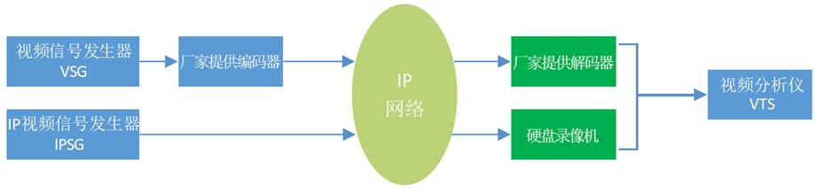 利用標準的視頻信號發(fā)生器VSG產(chǎn)生CCVS、YPbPr或HDMI信號,同時采用廠家提供的編碼器來實現(xiàn)IP化匹配,然后再通過IP網(wǎng)絡進行傳輸。相應的,接收端也需要廠家提供的相應解碼器來將IP數(shù)據(jù)轉換為視頻分析儀VTS所能接收的形式,然后再提供給視頻分析儀VTS進行測試。