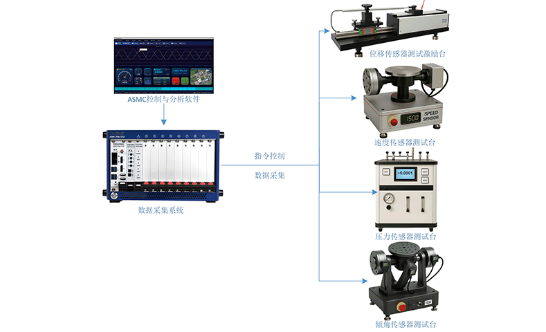 這些高度集成的測試臺在傳感器測試過程中發(fā)揮重要作用,配合數(shù)據(jù)采集系統(tǒng)和ASMC測試軟件,實現(xiàn)了從傳感器性能驗證到自動化數(shù)據(jù)處理的全過程,確保測試結(jié)果的高效性與準(zhǔn)確性。測試臺示意圖如下: