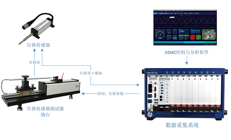 通過硬件與軟件的協(xié)同,本平臺可對被測傳感器在標(biāo)定過程中的輸出與基準(zhǔn)量進(jìn)行同步測量與分析。測試時,被測位移傳感器首先固定在專用測試臺上;測試臺的驅(qū)動與位移反饋線纜一并接入PXIe數(shù)據(jù)采集系統(tǒng)。ASMC 控制與分析軟件安裝于機(jī)框控制器內(nèi),經(jīng)輸出通道向測試臺下發(fā)位移行程、速度等指令,同時通過采集通道實時獲取傳感器電壓 / 電流信號及臺體位移基準(zhǔn)量。軟件在線完成閉環(huán)控制、波形顯示與指標(biāo)運(yùn)算,結(jié)果立即存儲并可導(dǎo)出。更換為壓力、傾角、速度等臺體時,僅需替換機(jī)械結(jié)構(gòu)和傳感器,信號線路與控制邏輯保持不變;板卡采用模塊化插拔,電氣與軟件通道自動映射,無須重新布線或二次開發(fā),即可在幾分鐘內(nèi)完成臺體切換,實現(xiàn)從單一物理量驗證到多量標(biāo)定的靈活擴(kuò)展。測試流程圖如下(以位移傳感器傳感器測試臺為例,不同測試臺間只有臺體結(jié)構(gòu)和被測傳感器不同,線路連接和具體控制方式均相同):