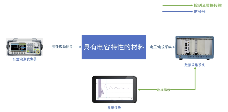 針對(duì)上述具有電容特性的材料,我司推出了一套基于數(shù)采系統(tǒng)和任意波形發(fā)生器的測試方案,可以有效測試不同類型材料的充放電性能。