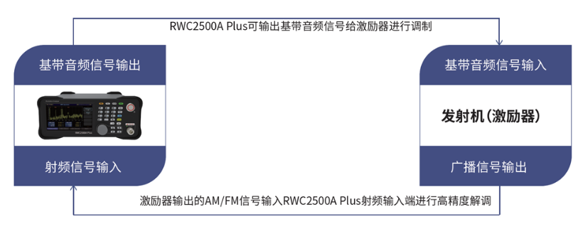 RWC2500A Plus具備調(diào)制分析模塊,音頻分析模塊和基帶音頻信號輸出模塊,測量調(diào)制度時我們需要使用基帶音頻信號輸出模塊,將基帶音頻信號輸入到發(fā)射機的音頻輸入端口,在發(fā)射機調(diào)制為廣播后將接過負(fù)載和TEST信號輸入RWC2500A Plus的射頻信號輸入接口,使用調(diào)制分析模塊進行分析。