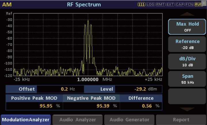 當(dāng)設(shè)置好輸入給發(fā)射機的基帶音頻信號之后,可以在ModulationAnalyzer界面的RF Spectrum界面中,直接查看AM的調(diào)制度和正負(fù)調(diào)幅度,也可在音頻發(fā)生模塊直接進行讀取。