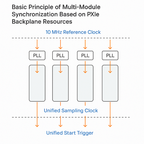 PXIe標準在機箱背板上為時鐘與觸發(fā)信號預留了豐富的硬件資源,使得多板卡同步可以在機箱內部以較為自然的方式實現。從原理上看,可以概括為三個層面:首先是統(tǒng)一參考時鐘,其次是統(tǒng)一采樣時鐘,最后是統(tǒng)一啟動觸發(fā)。典型PXIe機箱會在背板上提供10 MHz參考時鐘PXI_CLK10,以單端形式分發(fā)到所有插槽,用于傳統(tǒng)PXI模塊或作為鎖相環(huán)(PLL)的參考源;同時還會提供一組差分參考時鐘,例如100 MHz差分時鐘,以低抖動差分形式作為高速模塊的時間基準。多板卡同步的第一步就是讓各采集卡的時間基準鎖定到同一參考時鐘。通常,每塊采集卡內部的時鐘模塊會通過PLL鎖定到PXI_CLK10或PXIe差分時鐘,也可以由專用定時與同步模塊向背板注入高穩(wěn)定度參考時鐘,再由各采集卡進行鎖定。一旦所有采集卡都使用同一參考時鐘作為“母鐘”,便可以在此基礎上合成各自的采樣時鐘,同時避免長時間運行中的相對漂移。