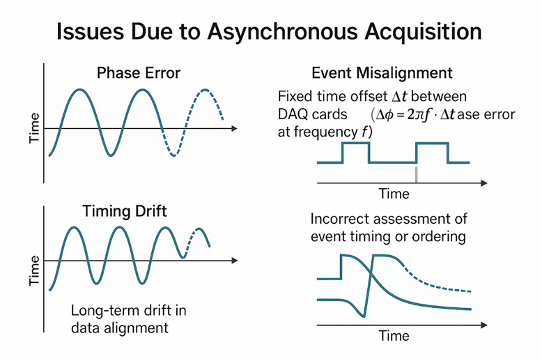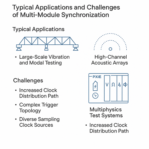 本文以PXIe平臺為基礎,聚焦同一PXIe機箱內多塊采集卡之間的通道同步問題,首先介紹多板卡同步的典型應用場景及面臨的挑戰(zhàn),然后分析若只保證單卡同步、板卡之間異步可能引發(fā)的系統(tǒng)級問題,最后結合PXIe背板資源,對多板卡同步的基本原理和常見實現方案進行論述。跨機箱、跨機柜的分布式時間同步問題將在后續(xù)文章中展開。