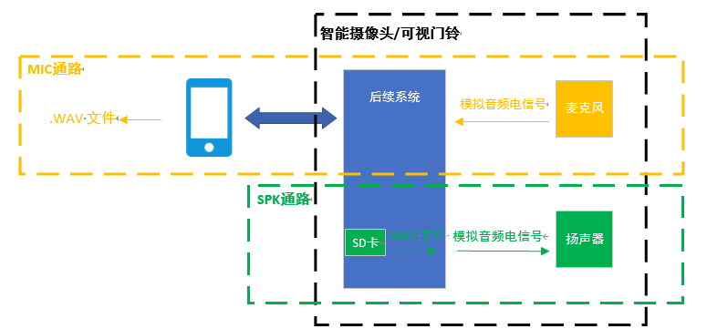 一般智能可視門鈴類產(chǎn)品的音頻系統(tǒng)可以分為麥克風音頻通路和揚聲器音頻通路。麥克風音頻通路由麥克風采集聲音信號轉(zhuǎn)換為模擬音頻電信號,后續(xù)系統(tǒng)接收到麥克風傳來的模擬音頻電信號將其轉(zhuǎn)換為數(shù)字音頻信號,通過無線網(wǎng)絡傳輸給移動終端,移動終端通過相應的APP 應用程序轉(zhuǎn)換為.wav 格式的音頻文件;揚聲器音頻通路由智能可視門鈴類產(chǎn)品的 SD 卡或者本機內(nèi)存存儲的.wav 文件,轉(zhuǎn)換為模擬音頻電信號傳輸?shù)綋P聲器,揚聲器接收到模擬音頻電信號轉(zhuǎn)換為聲音信號發(fā)送出去。