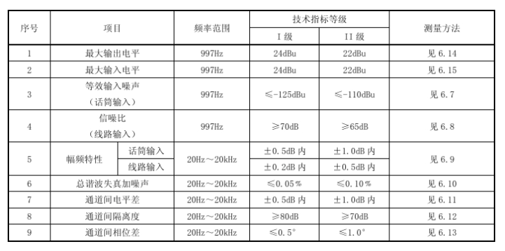 圖1所示為標準中規(guī)定的模擬輸入-模擬輸出接口的全部測試指標以及指標要求,包括:最大輸出電平、最大輸入電平、等效輸入噪聲(話筒輸入)、信噪比(線路輸入)、幅頻特性、總諧波失真加噪聲、通道間電平差、通道間隔離度以及通道間相位差。下文將主要介紹如何使用音頻分析儀測試信噪比、幅頻特性以及總諧波失真加噪聲。