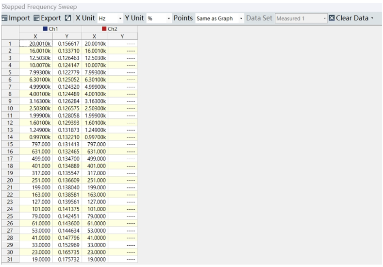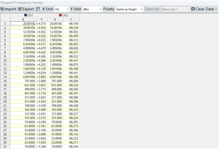 如圖8所示,可查看具體不同頻點處的總諧波失真加噪聲值表格,也可將數據導出。
