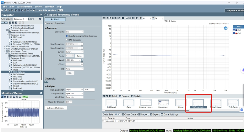 測試總諧波失真加噪聲也可在頻率步進掃描測試功能中完成,如圖7所示在結果顯示處選擇THD+N Ratio,按照測試方法配置參數后點擊Start即可得到總諧波失真加噪聲隨頻率變化的曲線。