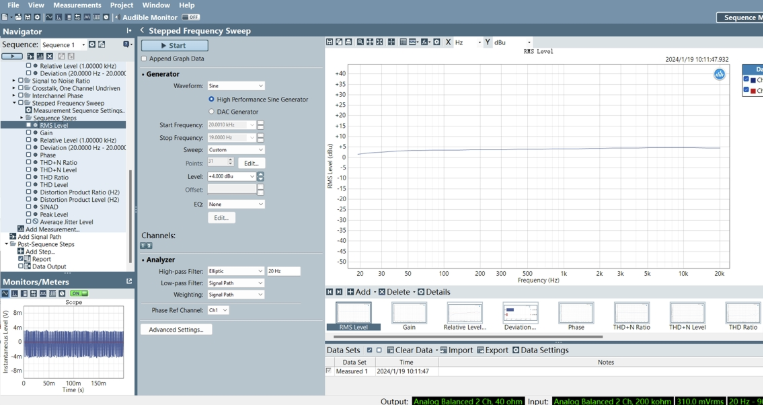 使用音頻分析儀中的頻率步進掃描(Stepped Frequency Sweep)功能即可完成此項指標的測試,如圖4所示,按照方法要求設置參數后點擊Start即可得到電平隨頻率變化的曲線。