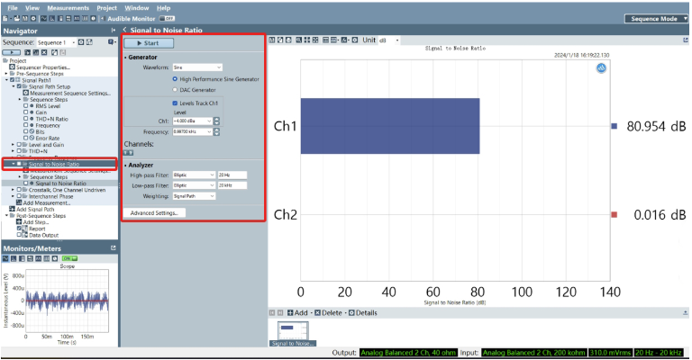 使用音頻分析儀自帶的信噪比測量功能,在滿足標準規(guī)范的測試原理下可實現一鍵測試。下圖所示為信噪比測試界面,按照標準要求設置濾波器、輸出信號頻率以及電平后點擊start即可得到信噪比測量值S/N=80.954dB,滿足Ⅰ級標準要求。