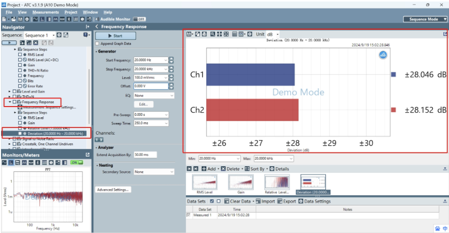 使用音頻分析儀中的頻率響應(yīng)(Frequency Response)測(cè)試項(xiàng)進(jìn)行測(cè)試,按照測(cè)試需要設(shè)置掃頻范圍以及輸出功率,點(diǎn)擊Start待音頻播放完畢后即可得到被測(cè)物的頻響曲線,也可直接查看平坦度。