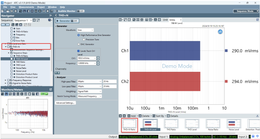 使用失真度測(cè)試項(xiàng),設(shè)置輸出信號(hào)頻率以及電平,點(diǎn)擊Generator即可發(fā)生信號(hào)測(cè)得失真度結(jié)果,可查看總諧波失真加噪聲占比或單獨(dú)查看失真占比或噪聲占比,也可查看失真以及噪聲的功率大小。